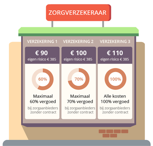 Neem bijvoorbeeld VGZ, die heeft drie varianten van de basis zorgverzekering. Deze kosten € 99,95, € 107,95 en € 113,95. Het verschil zit hem niet in de zorg die onder de dekking valt, maar vooral in het deel dat je zelf betaalt als VGZ geen afspraken heeft met de zorgverlener. Bij de duurste variant betaal je in dat geval niets zelf, bij de goedkoopste 25 procent of meer. Ook onder andere Menzis en CZ maken onderscheid.