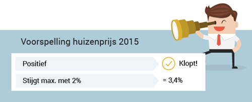 2015 was een mooi jaar voor mensen met een eigen huis. Stijgende huizenprijzen en een laagste hypotheekrente die steeds verder daalde. De verwachting voor 2016 is nóg iets positiever. Blikken we terug op 2015 dan zien we dat onze voorspellingen grotendeels netjes uitkwamen. Eén voorspelling, die van de huizenprijs, bleek in werkelijkheid nog iets mooier dan de voorspelling.