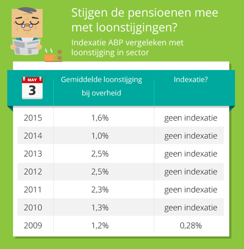 Ambtenarenpensioenfonds ABP heeft voor 2016 de pensioenen opnieuw niet verhoogd. De laatste keer dat ABP de uitkeringen verhoogde was in 2009. In de periode tussen 2008 en 2015 bedraagt de gemiste indexatie ten opzichte van de lonen in de overheids- en onderwijssector inmiddels 11,7%.