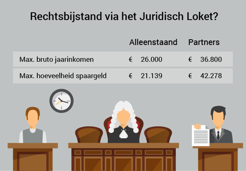 Om in aanmerking te komen voor rechtsbijstand via de rechtswinkel of het Loket geldt een maximaal salaris van € 26.000 tot € 36.800.