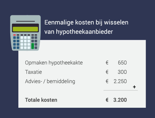 Wanneer je van hypotheekaanbieder verandert, betaal je eenmalige kosten. Zo moet je huis opnieuw getaxeerd worden en is er sprake van advieskosten. Onderstaand een reële schatting van de kosten, die in dit voorbeeld bekostigd worden met spaargeld: