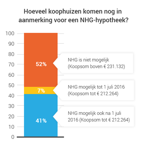 - Tot 1 juli 2016 geldt een NHG-kostengrens van € 245.000. De koopsom van je huis mag maximaal € 231.132 bedragen.