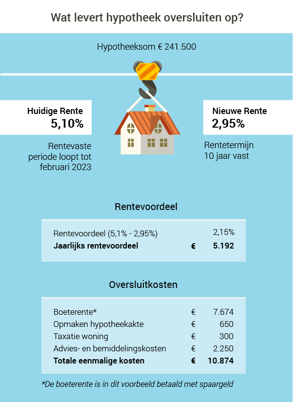 Wat het oversluiten van je hypotheek oplevert, hangt af van jouw hypotheeksituatie. Belangrijk is hoe lang jouw renteafspraken nog lopen. Uiteraard is ook de hoogte van de huidige rente op je hypotheek bepalend. Uit het onderstaande voorbeeld wordt dit duidelijk, waarbij rekening is gehouden met alle bijkomende kosten.