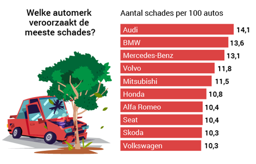 Opvallend is dat de duurdere automerken - Audi, BMW en Mercedes - bovenaan de lijst met meeste aanrijdingen per 100 auto's prijken. Dat zijn toch juist de auto's die tjokvol vernuftige elektronica zitten? Een mogelijke verklaring is dat deze auto's vaak zakelijk gebruikt worden, en daardoor ook veel meer kilometers maken.