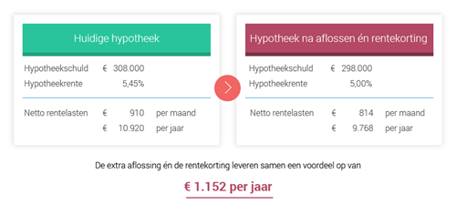 De extra aflossing scheelt ze zo geen € 360 per jaar, maar ruim het driedubbele. Door de lagere hypotheekrente betalen ze in totaal € 1.152 per jaar minder. Een besparing van netto € 96 per maand.
