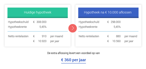 Stel, je hebt een mooi bedrag over en dat wil je gebruiken voor het aflossen van je hypotheek. Zo dalen je maandlasten, iets waar je iedere maand plezier van hebt. Bovendien is het een prettig idee om je hypotheekschuld af te bouwen en zo de kans op een restschuld te verkleinen. We laten het effect zien middels een rekenvoorbeeld: