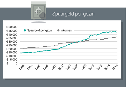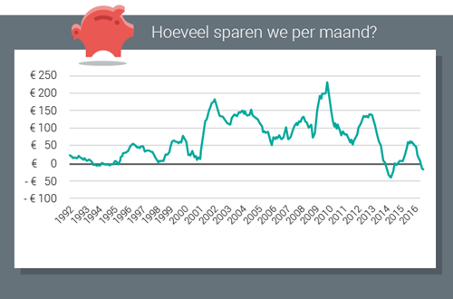 Sinds 1992 sparen we zo’n € 70 per gezin per maand. De term ‘gemiddeld’ is hierbij overigens wat vreemd, want in 1992 was die € 70 nog een stuk meer waard dan nu. In 1992 bedroeg een modaal inkomen € 21.500. Anno 2016 is dat € 36.500.