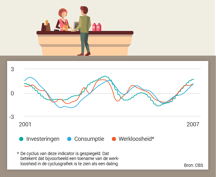Meestal als we het hebben over de conjunctuur, bedoelen we de cyclus van Jugar. Deze cyclus bestaat uit een relatief stabiele periode van welvaart, ofwel: veel spullen durven en kunnen kopen. De periode gaat meestal geleidelijk over in een periode van recessie, waarin we ons geld vooral op de spaarrekening laten staan en weinig nieuwe spullen kopen.