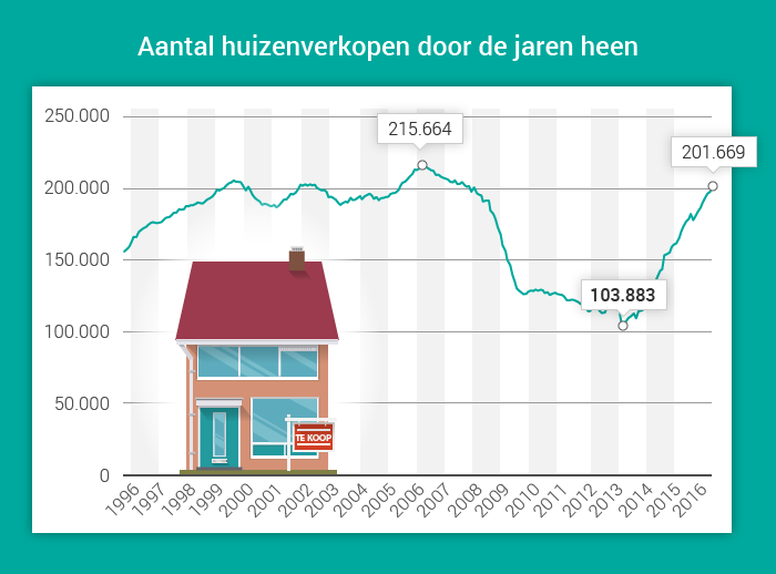 De laatste keer dat er meer dan 200.000 huizen op jaarbasis werden verkocht, was in april 2008. Daarna kwam de crisis en daalde het aantal huizenverkopen flink. Het dieptepunt lag tussen juni 2012 en juni 2013. In dat jaar (ver)kochten Nederlanders 103.883 huizen. Dat was het laagste aantal in twintig jaar. Die tijd ligt gelukkig ver achter ons.