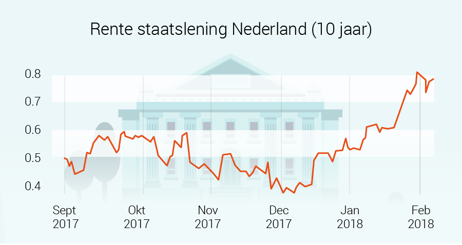 Een goede indicatie van de richting van de hypotheekrente is de rente die de Nederlandse overheid betaalt bij het lenen van geld. Ofwel, de rente op Nederlandse staatsobligaties. Die is in sinds eind december bijna verdubbeld, dat was rond de 0,4 procent en schurkt nu tegen de 0,8 procent aan.