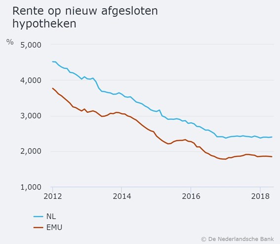In 2018 heeft driekwart van de nieuw afgesloten hypotheken een rentevaste periode van meer dan vijf jaar. In 2012 lag dit aantal met 40 procent fors lager. Ook kiezen meer woningkopers voor een rentetermijn van 10 jaar vast of langer. Een teken dat kopers op termijn een stijging verwachten, zo is ook de voorzichtige conclusie van de Nederlandsche Bank (DNB). De daling van de hypotheekrente is in ieder geval een halt toegeroepen.