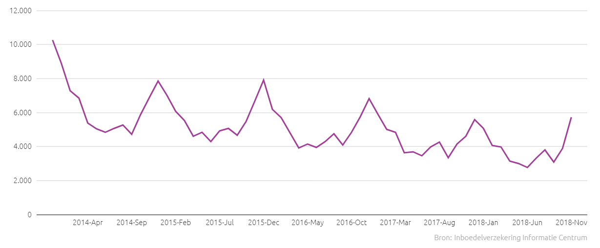 Het aantal woninginbraken daalt al enkele jaren. Het Inboedelverzekering Informatie Centrum (IIC) onderzocht politiecijfers van de afgelopen vijf jaar. Van januari 2017 tot en met november 2018 is er 46.915 keer ingebroken. Dit aantal ligt tien procent lager dan in dezelfde periode vorig jaar. Ondanks de daling blijft eind van het jaar een forse piek zichtbaar. Dit jaar is ook november erg ‘in trek’.
