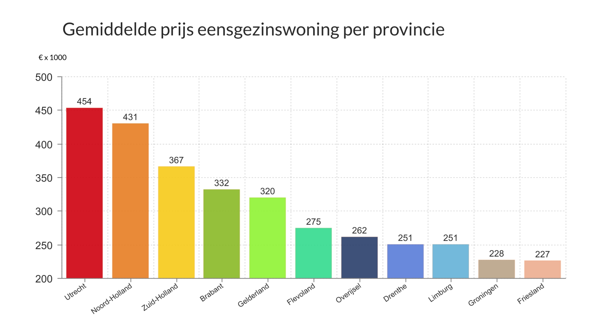 Wonen in het noorden van het land is doorgaans een stuk goedkoper dan wonen in de Randstad. In Utrecht betaal je voor een eengezinswoning gemiddeld €454.000, gevolgd door Noord-Holland met €431.000. In Groningen en Friesland ben je hiervoor respectievelijk €228.000 en €227.000 kwijt.