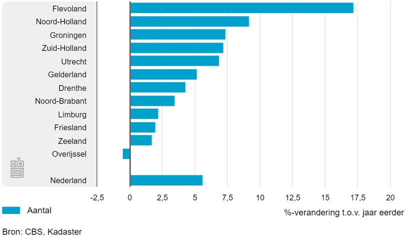 Voor het tweede kwartaal op rij werden de meeste woningen verkocht in Flevoland. Er werden 17 procent meer woningen verkocht, fors meer dan nummer twee Noord-Holland (9,2 procent). Opvallend is dat ook in de grootste steden het aantal verkopen op jaarbasis hoger lag. Goed nieuws voor mensen die in Amsterdam, Rotterdam en Utrecht op zoek zijn naar een woning. Overigens is daarmee het nijpende woningtekort niet opgelost voor de komende tijd.