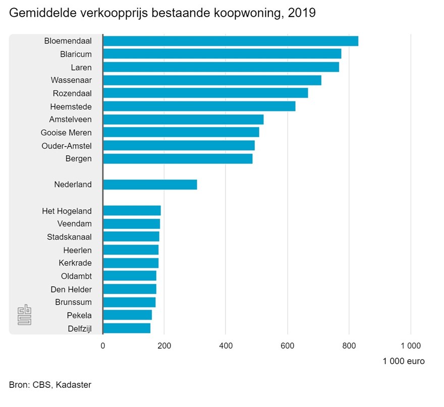 Acht van de tien gemeenten met de hoogste gemiddelde verkoopprijs liggen in de provincie Noord-Holland. Aan de andere kant van het spectrum ligt Groningen. In dit hoge noorden liggen de meeste gemeenten met de laagste gemiddelde verkoopprijs.