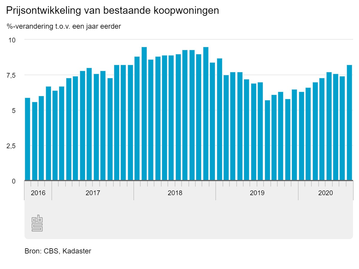 Van verkoeling op de woningmarkt is nog geen sprake, gezien de cijfers van het Kadaster over augustus. In die maand waren bestaande koopwoningen 8,2 duurder dan in dezelfde maand een jaar eerder. Het gaat om de grootste stijging in ruim anderhalf jaar. Wel daalde het aantal verkopen licht.