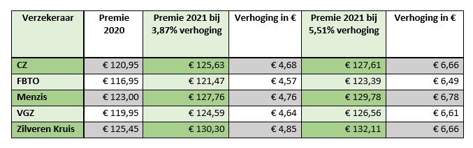 Jaarlijks presenteert DSW als eerste de nieuwe zorgpremie voor het volgende jaar. In 2021 verhoogt de zorgverzekeraar haar premie met €6,50 naar €124,50. Deze stijging is hoger dan de eerdere verwachting van het kabinet. Als we uitgaan van de stijging bij DSW, dan betaal je het volgende bij grote aanbieders als Menzis, CZ en VGZ.