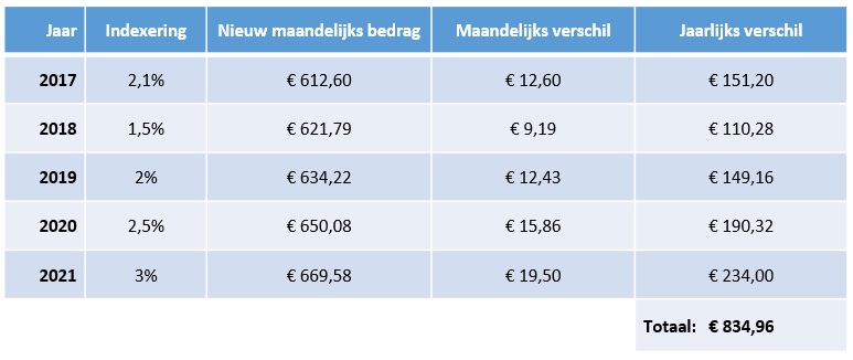 Wordt de alimentatie niet jaarlijks verhoogd, dan heb je ieder jaar 12 maanden waarin je een bedrag aan alimentatie misloopt. Hierdoor kan een percentueel kleine verhoging op termijn een behoorlijk verschil maken. In onderstaande tabel zie je wat je misloopt als de alimentatie in de afgelopen vijf jaar niet geïndexeerd is. In het voorbeeld gaan we uit van €600 aan alimentatie in 2016.