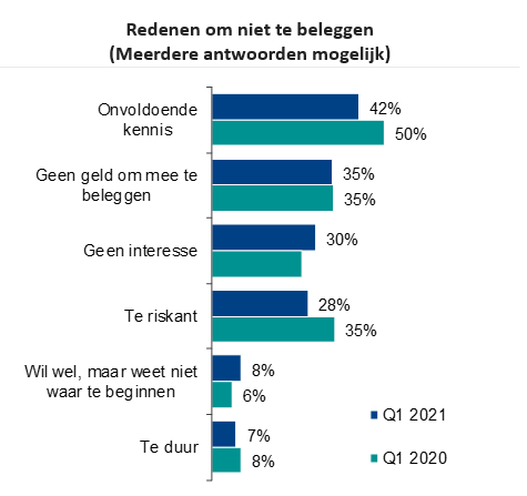 De Autoriteit Financiele Markt (AFM) onderzocht onder een representatieve groep van 800 mensen de wens om te beleggen. Zowel in voorjaar 2020 als in de meting van april van dit jaar, is gebrek aan kennis de meest genoemde reden om niet te beleggen. Wel daalde het percentage mensen dat dit als reden aangaf. Ruim een derde van de niet-beleggers geeft aan niet te beleggen omdat ze er geen geld voor hebben. Daarnaast vond vorig jaar een vergelijkbaar aantal respondenten (35%) beleggen te riskant. Dit percentage is nu gedaald naar 28%.