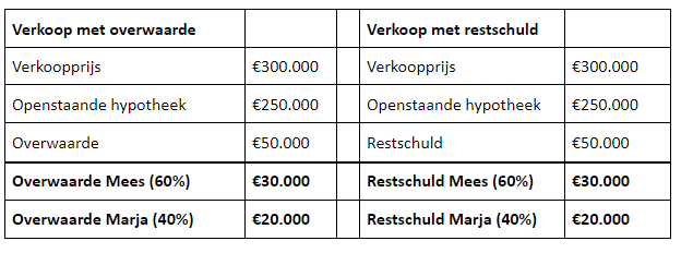 Wanneer je beiden eigenaar bent van de woning, verdelen jullie bij verkoop de winst of het verlies. Hoeveel je krijgt uitgekeerd of hoeveel je moet betalen, is afhankelijk van de eigendomsverhouding van de woning. Meestal is er sprake van een gelijke verdeling. In dat geval krijg of betaal je de helft. Maar soms is bij aankoop van de woning een andere verdeling afgesproken. Dan krijg / betaal je op basis van deze verdeling. Onderstaand een voorbeeld van een stel waarbij Mees voor 60% eigenaar is van de woning en Marja 40%.