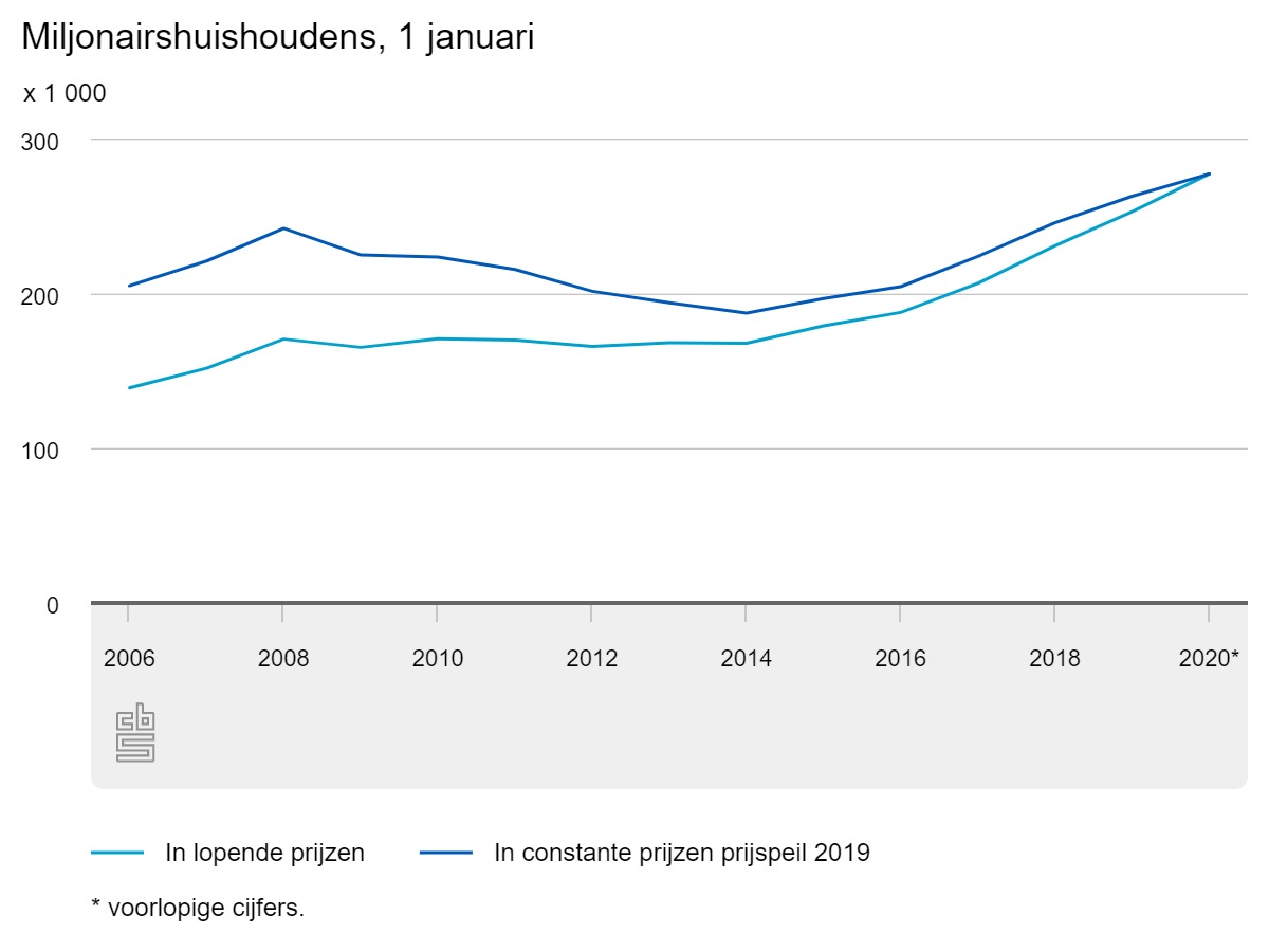 Het aantal in Nederland wonende miljonairs neemt al sinds 2014 toe. Voor die tijd zorgde de crisis voor een gelijkblijvend niveau. Er waren in 2020 ruim 100.000 miljonairs meer dan in 2008. Wel moet er rekening gehouden worden met inflatie. Rekening houdend met de algemene prijsontwikkeling, lag het aantal miljonairs vorig jaar circa 35.000 hoger dan in 2008.