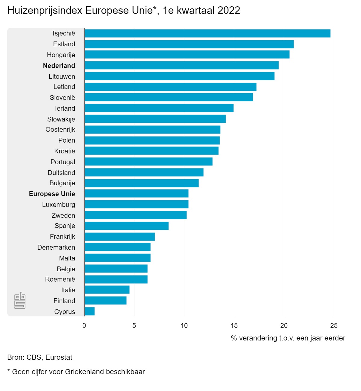 De gemiddelde stijging van de huizenprijs is in Nederland bijna het dubbele van het Europees gemiddelde (10,5%). Toch kan het nog gekker. In Tsjechië steeg de huizenprijs in het eerste kwartaal van 2022 met maar liefst 24,7 procent vergeleken met hetzelfde kwartaal in 2021. Op nummer twee en drie staan Estland (+21%) en Hongarije (+20,6%). Dit blijkt uit cijfers van het Centraal Bureau voor de Statistiek (CBS).