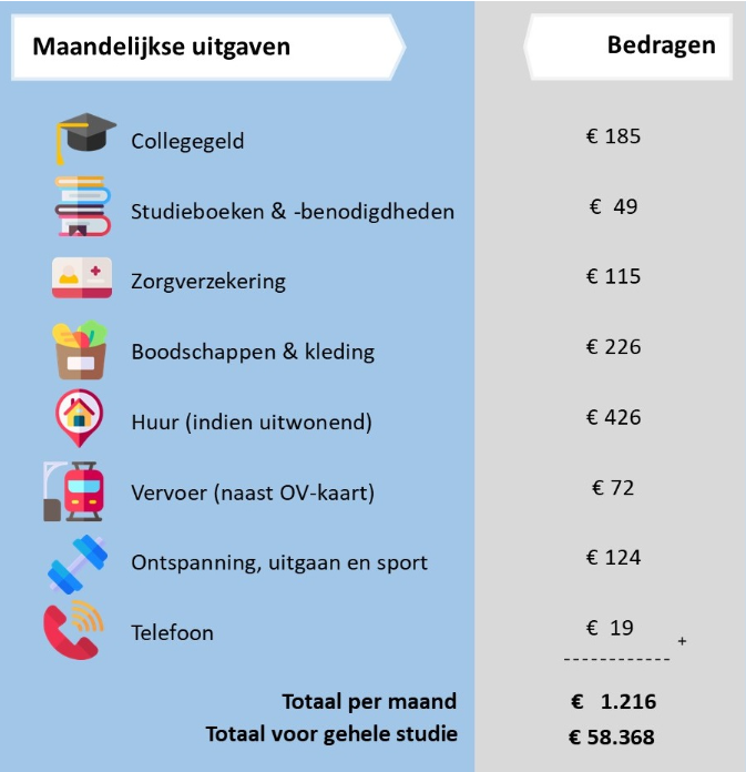 Bij studiekosten komt meer kijken dan alleen collegegeld. Denk bijvoorbeeld ook aan kosten voor studieboeken, vervoer en een mobiel abonnement.