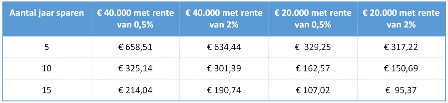 Ook met studiefinanciering blijft studeren een flinke investering. Als ouder kun je zelf bepalen in hoeverre je wilt bijdragen aan de studie en het studentenleven. Hieronder geven we een indicatie hoeveel je maandelijks moet sparen als je voor de aanvang van de studie van je kind € 40.000 of € 20.000 wilt hebben. Hierbij gaan we uit van de lage huidige rente van 0,5%. Het is vrij waarschijnlijk dat de spaarrente de komende jaren stijgt en we geven ook aan hoeveel je maandelijks opzij moet zetten bij 2% rente.