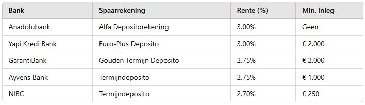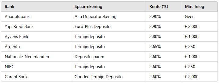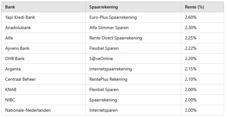 In het overzicht zijn alle spaarbanken meegenomen die onder het Nederlandse Depositogarantiestelsel vallen en waar geen voorwaarden als een minimaal spaarsaldo gelden.